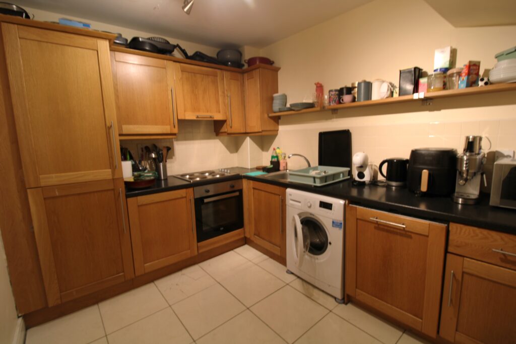 Kitchen/Dining Room: modern fitted kitchen with wall and floor mounted units, fitted, shelving, tiled splash-back, tiled floor, oven and hob, plumbed for washing machine and dishwasher