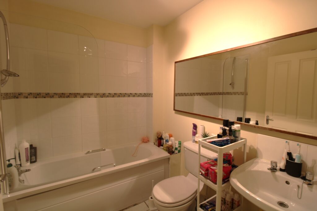 Bathroom: with bath, W.C and W.H.B, partially tiled walls and tiled floor