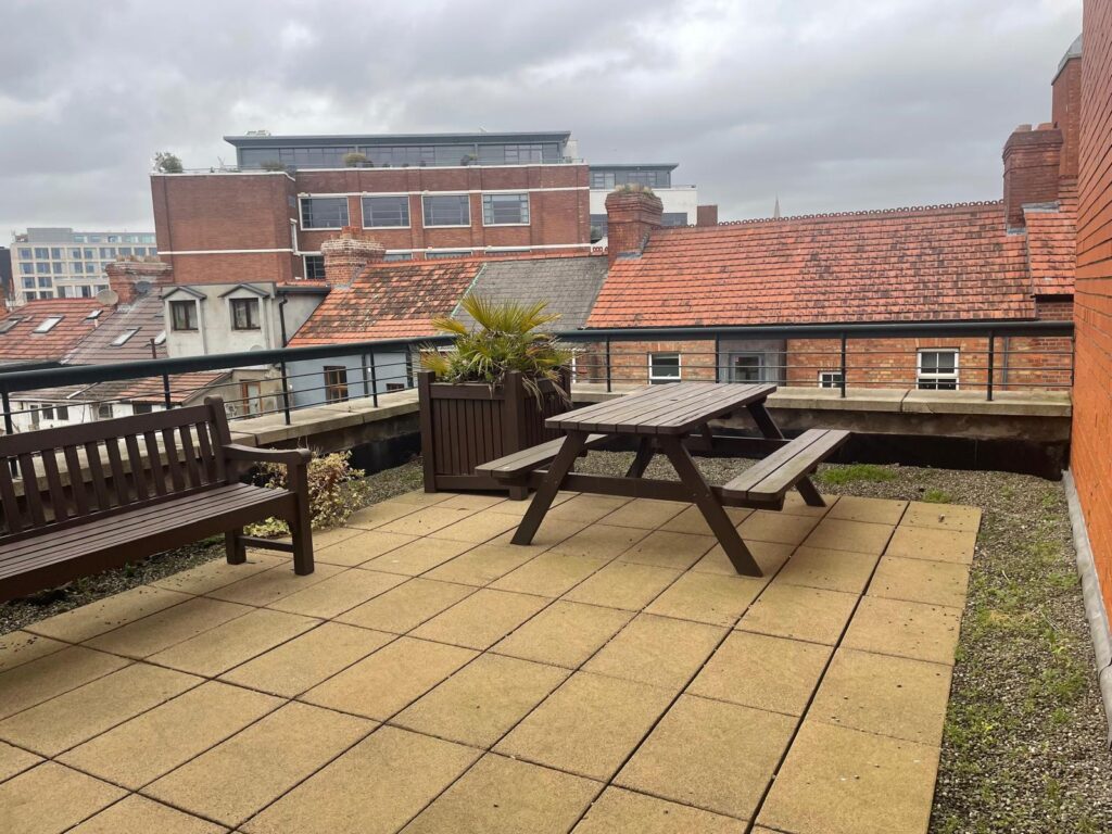 Rooftop common balcony with views overlooking garden