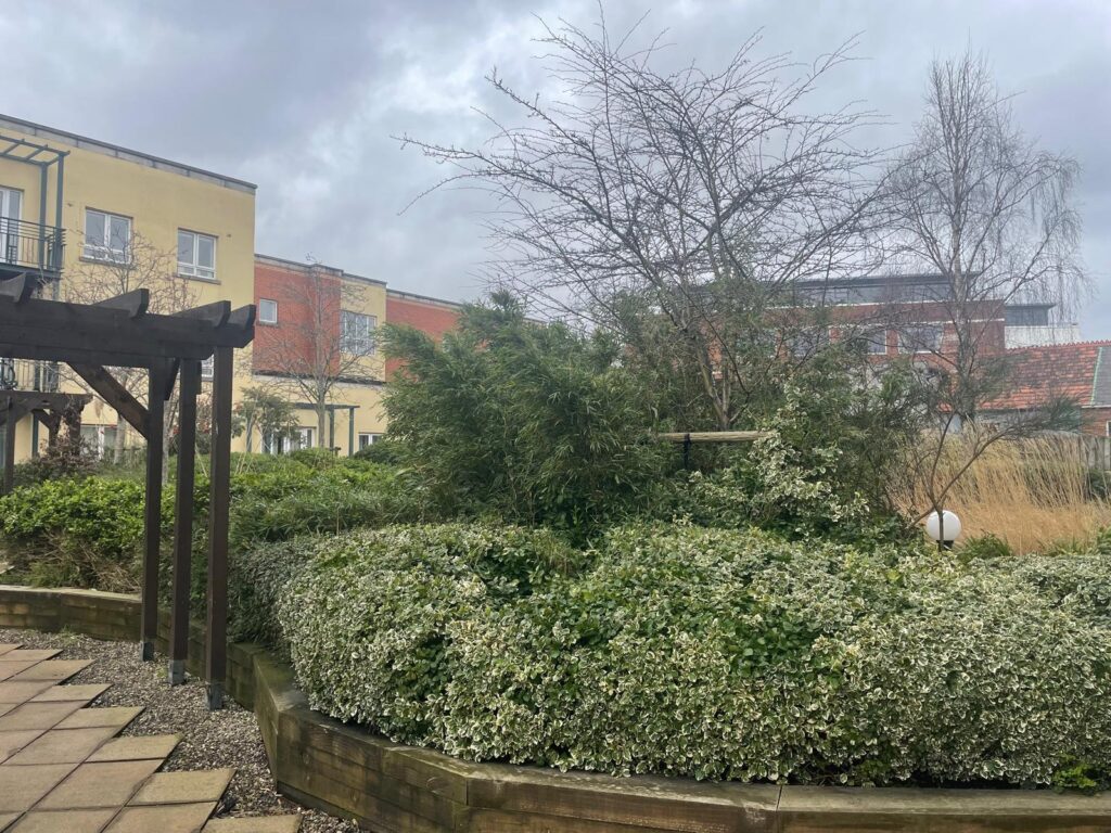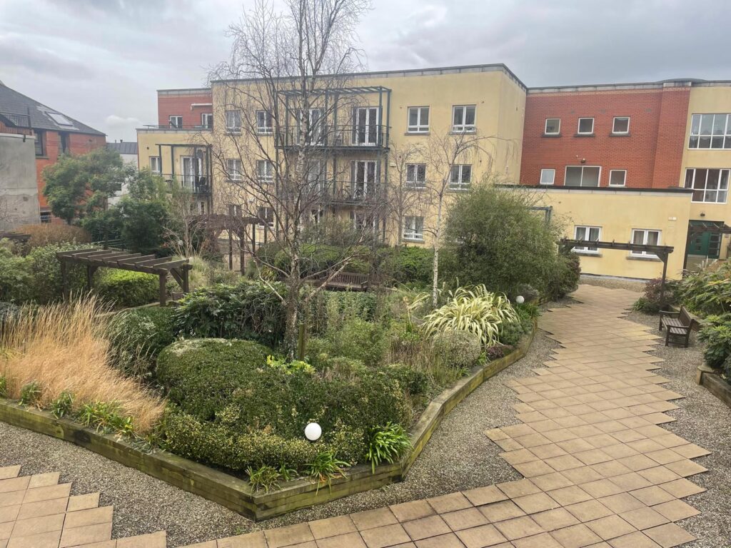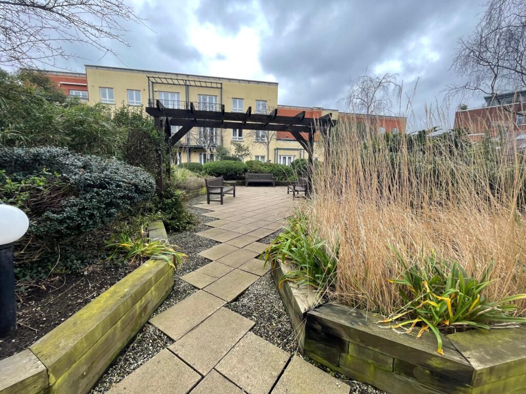Courtyard common garden area landscaped with varieties of plants and shrubs with extensive patio and decking areas
